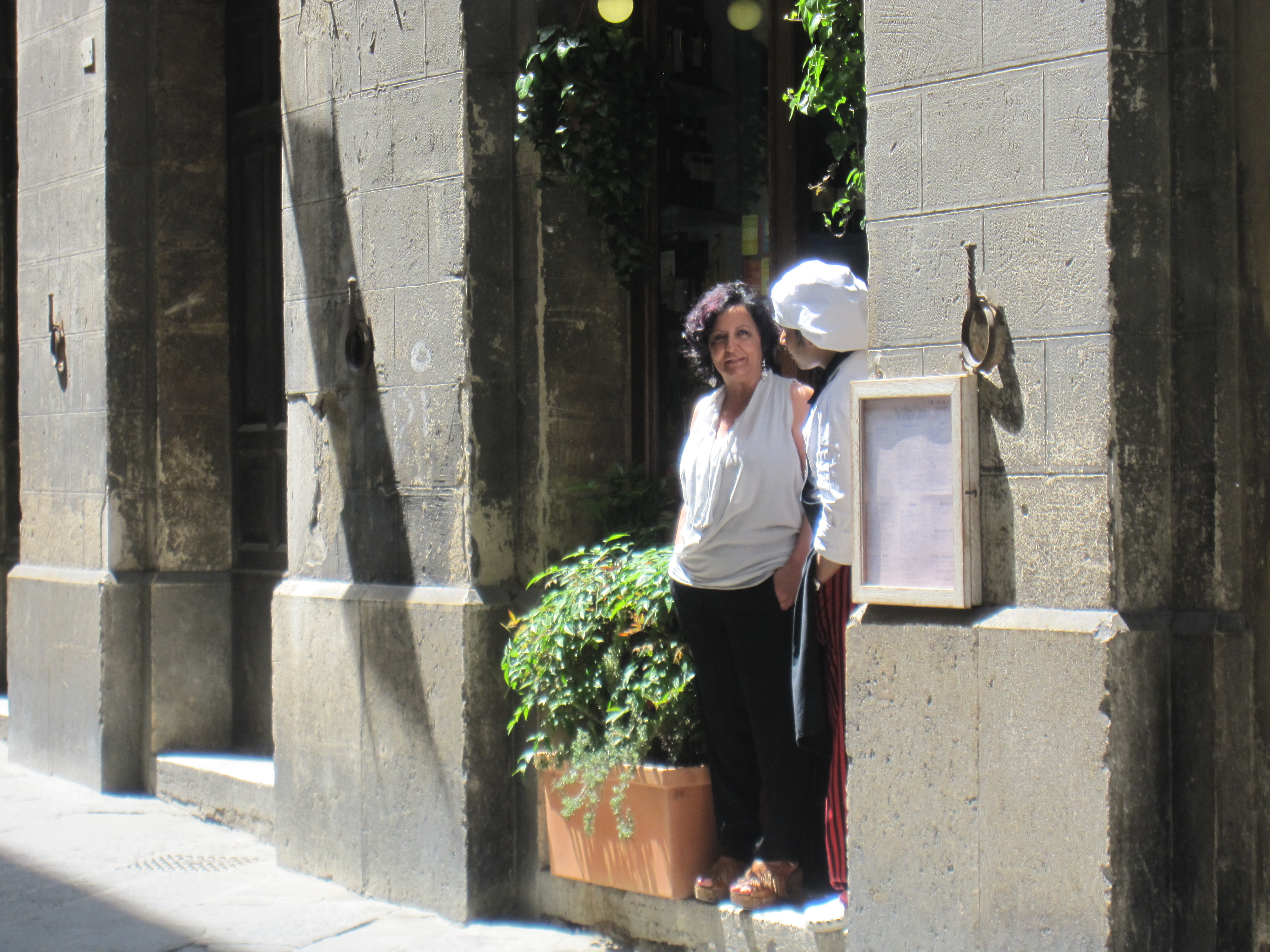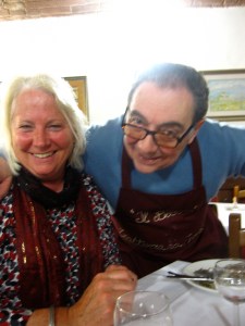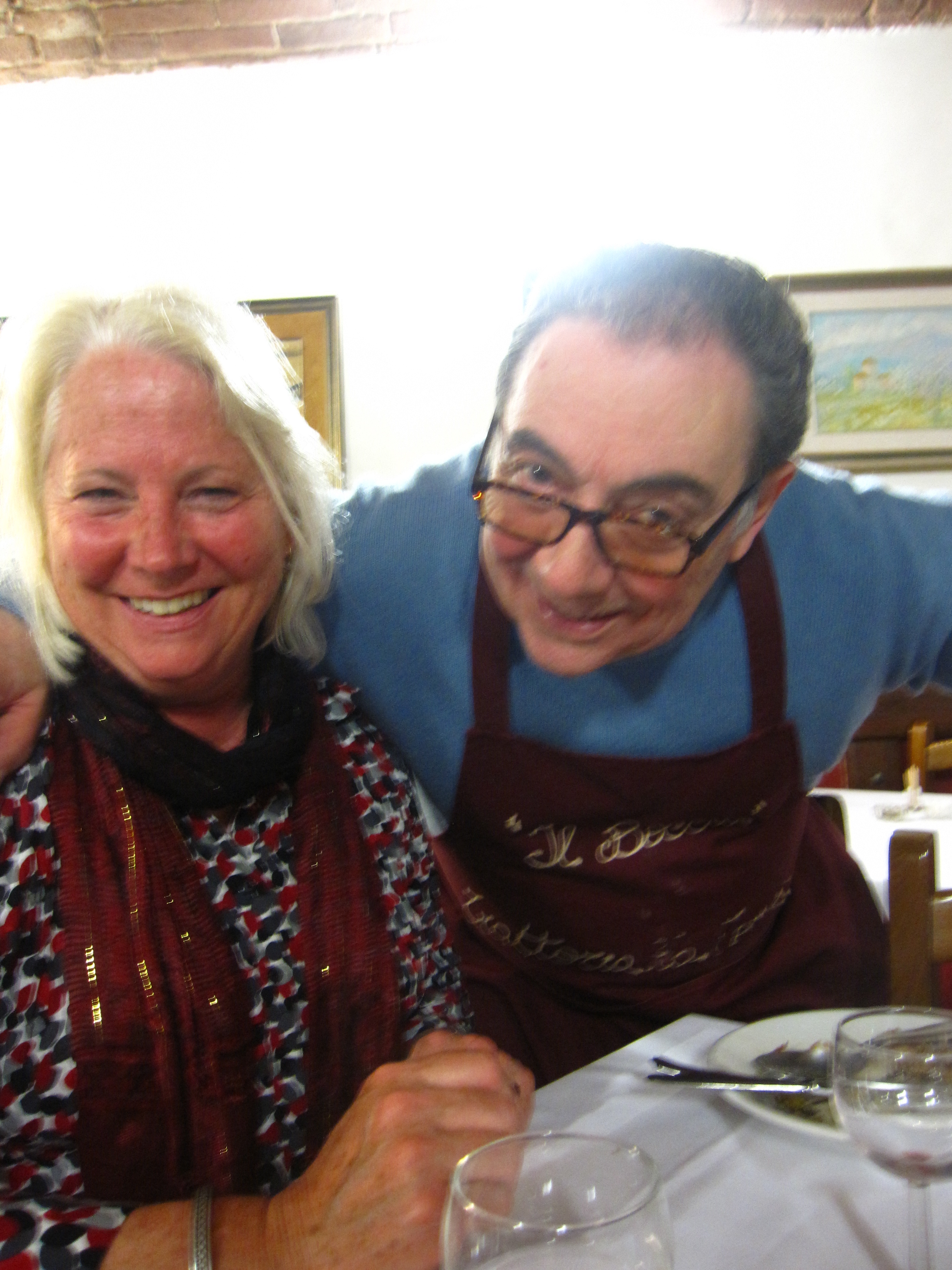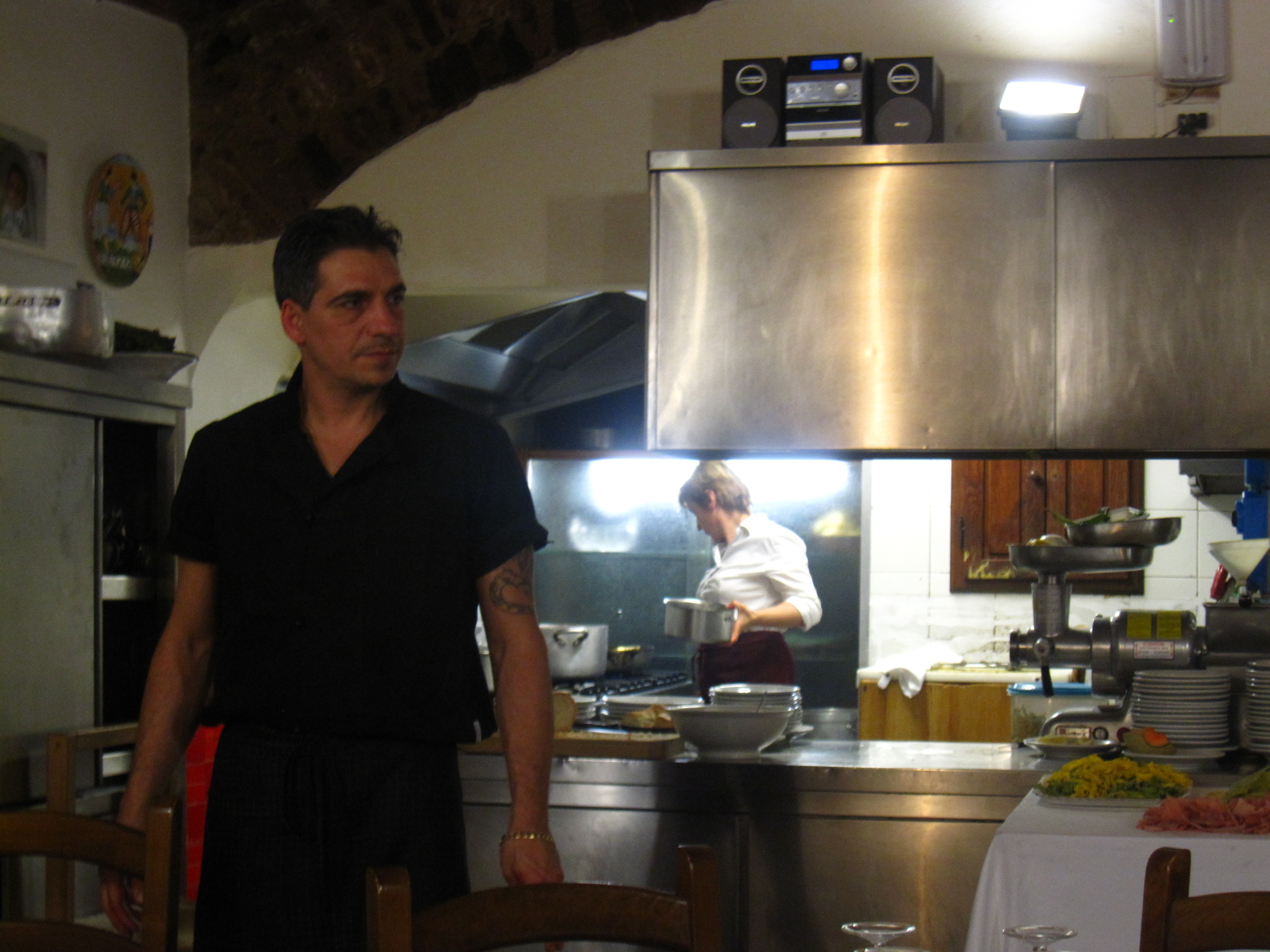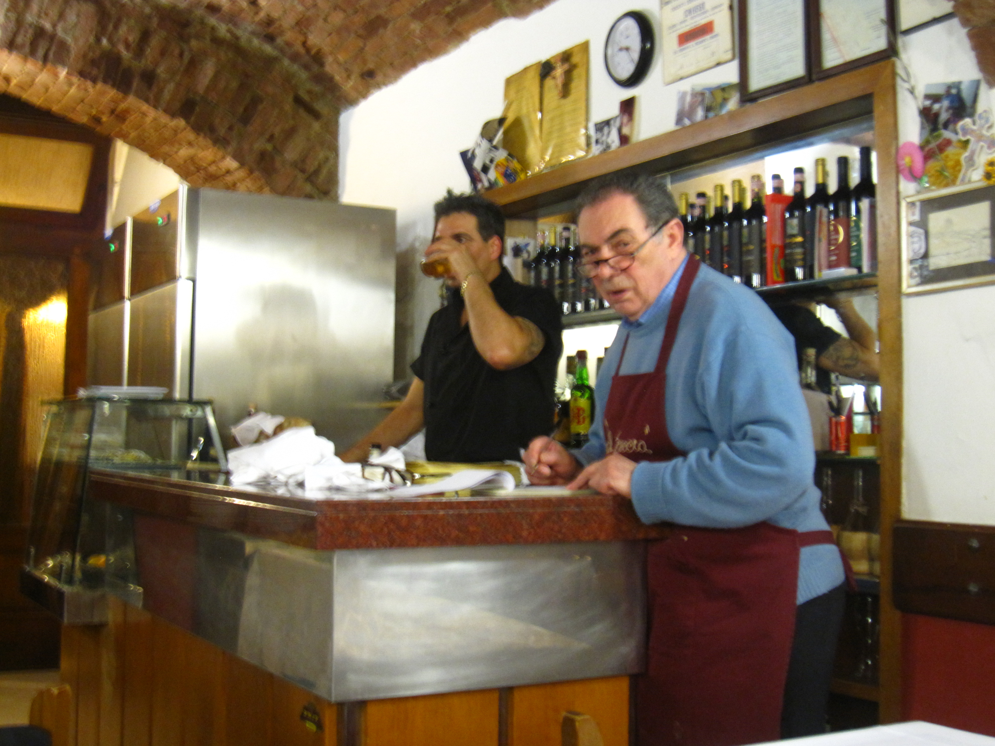 When we finished, the owner came over and WITHOUT LOOKING AT A LIST OR A MENU, told us everything we had ordered, from aperitivo to the last espresso! Then he went to the bar, which is right next to the kitchen, where his son was having a drink. At the bar, he figured out how much our dinner cost. You can see them both in this picture. The dad looks angry, but I think he is just trying to figure out the cost of our dinner.