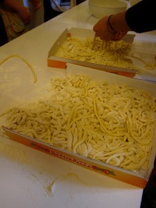 About a week ago, our Italian class and Ann and I made a special Siena pasta called “pici”. We mixed flour and water and a little oil, then stirred for awhile. After that, we took little globs of the dough and rolled them into worms.