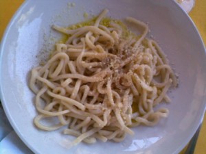 Finally, we boiled the pici, poured on some olive oil, then sprinkled it with cheese