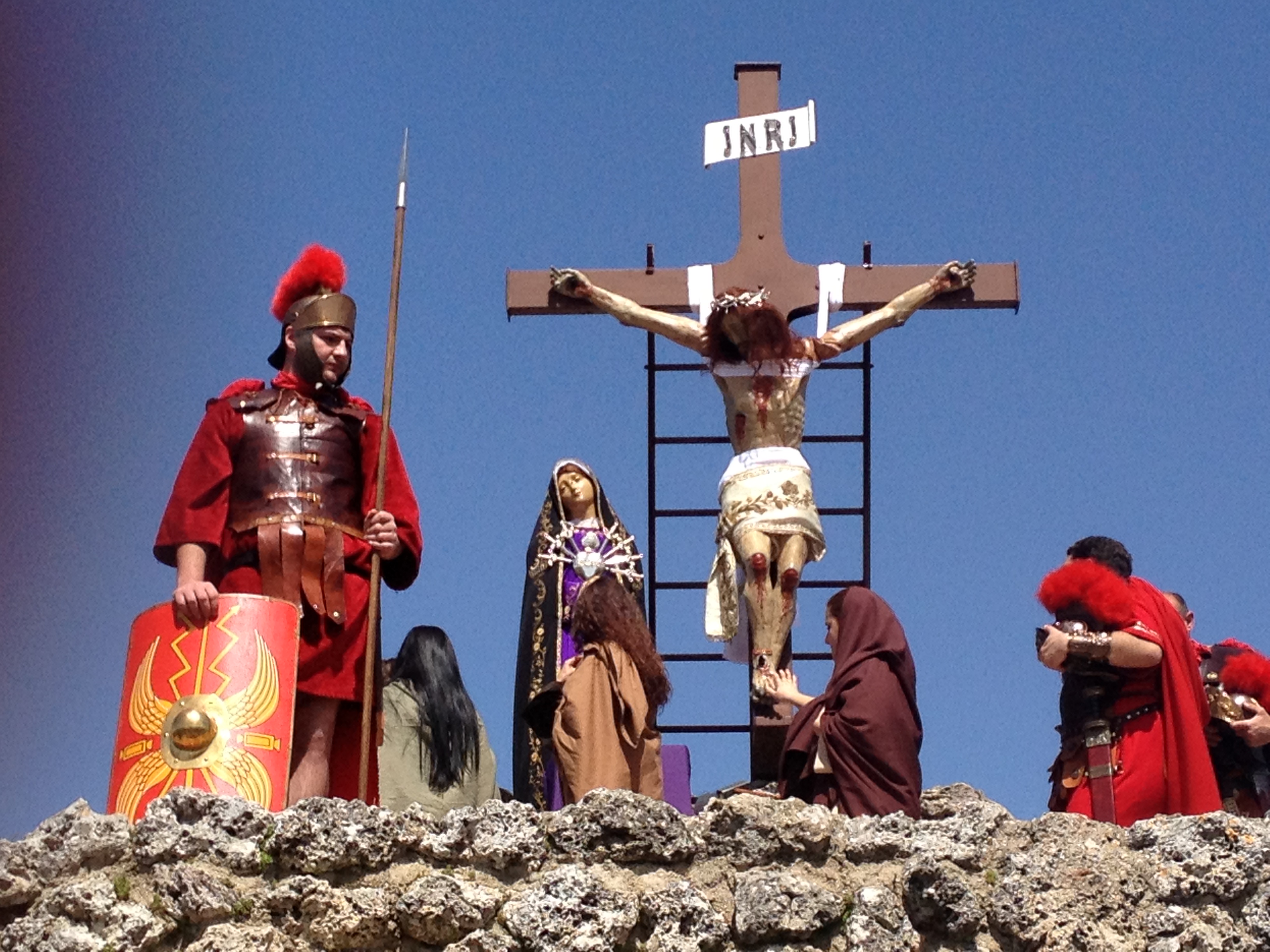 Monte Calvario, after the Crucifixion (the man who has carried the cross up this hill has left, and this statue has been nailed to the cross). The statue of Mary, with a long black veil and a silver heart pierced with swords, has also been put up next to the cross.